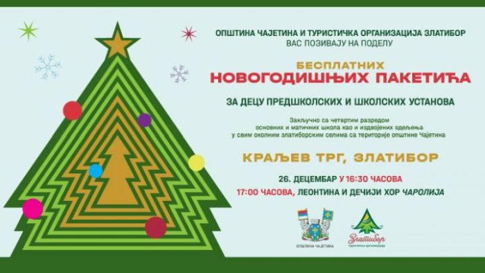 Општина Чајетина и Туристичка организација Златибор у петак, 26. децембра, на Краљевом тргу са почетком у 16:30 часова организују новогодишњу поделу бесплатних пакетића за децу предшколских и школских установа, закључно са четвртим разредом основних и матичних школа као и издвојених одељења у свим околним златиборским селима, са територије Општине Чајетина.