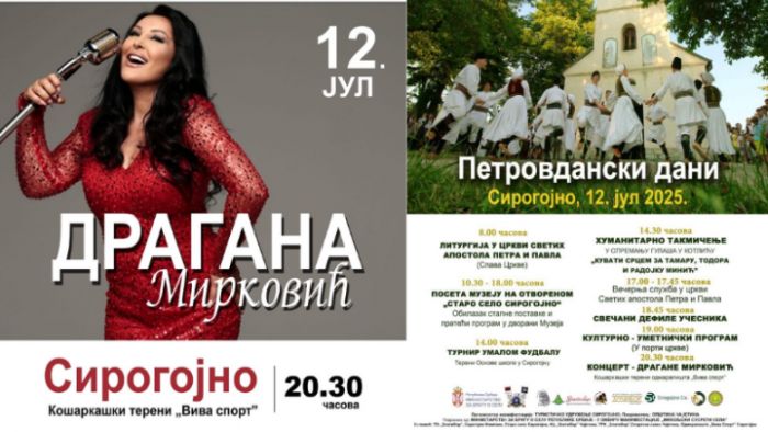 У златиборском селу Сирогојну, 12. јула, одржаће се манифестација „Петровдански дани“ која промовише традицију и културно наслеђе. Манифестација је предвиђена да почне у раним јутарњим часовима свечаном Литургијом у Цркви Светих апостола Петра и Павла, прослављајући славу села.  Након литургије за све посетиоце ће бити организована бесплатна посета Музеју Старо село, обилазак сталне музејске поставке и организован пратећи програм у дворани Музеја.
