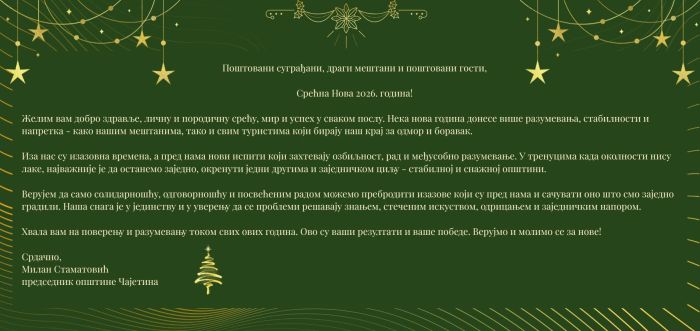 Желим вам добро здравље, личну и породичну срећу, мир и успех у сваком послу. Нека нова година донесе више разумевања, стабилности и напретка – како нашим мештанима, тако и свим туристима који бирају наш крај за одмор и боравак.