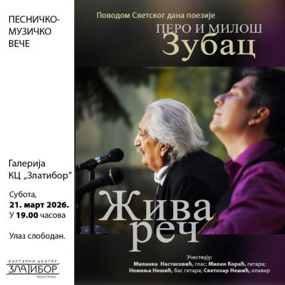 Поводом светског дана поезије, Културни центар, у суботу, 21. марта, у 19 часова, организује организује Песничко-музичко вече „Жива реч” – Перо и Милош Зубац.