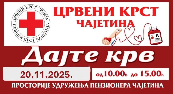 Редовна акција добровољног давања крви у организацији Црвеног крста Чајетина и Службе за трансфузију крви ОБ Ужице, спровешће се у четвртак, 20. новембра у просторијама Удружења пензионера Чајетина у термину од 10 часова и трајати до 15 часова.
