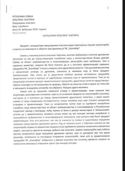 „Да се због свих безакоња која су учињена у приватизацији ранијег ПK „Златибор“ тражи поништавање решења о приватизацији и раскидање уговора о њој како би се спречило да државна имовина пређе у приватно власништво “, наводи се у иницијативи.