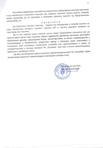 Скупштина општине Чајетина је на данашњој седници једногласно подржала иницијативу председника општине Милана Стаматовића, свим државним органима за поништење приватизације Пољопривредног комбината „Златибор“.
