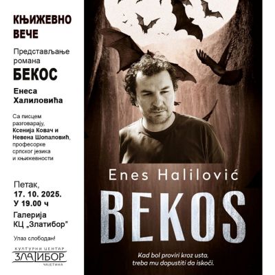 У петак, 17. октобра, у 19 часова, у Галерији Културног центра биће представљен роман „Бекос”, једног од најзначајнијих савремених књижевника, Енеса Халиловића. Мајстор приповедања сплео је мрежу прича савремене историје, криминалних кругова, са обичајима, традицијом и веровањем народа свога краја.